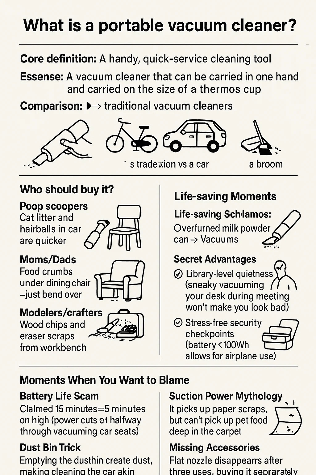 Perbandingan: ► vs pembersih vakum tradisional: Seperti basikal lipat berbanding kereta, mengorbankan prestasi untuk kebolehgunaan muktamad. ► vs penyapu: Ia adalah pemenang untuk serbuk biskut dalam lipit sofa; Ia tidak berguna untuk membersihkan kawasan lantai yang besar.