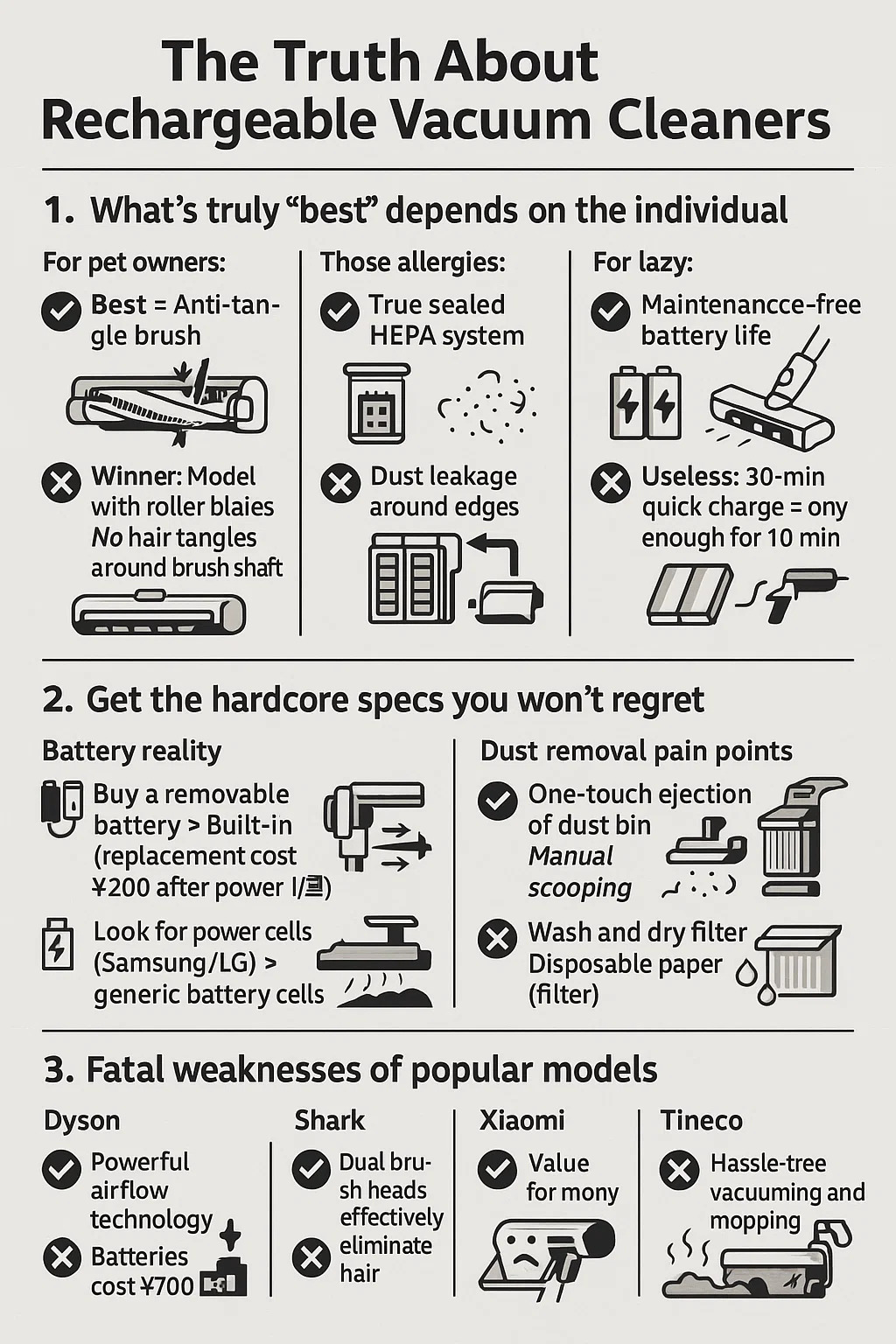 Bagi pemilik haiwan kesayangan: "terbaik" = berus anti-tangle tiada kusut rambut di sekitar batang berus. Pemenang: Model dengan bilah roller (menghisap dan memotong serentak, menghapuskan pembongkaran). GIMMICK: Kuasa sedutan 200AW, tetapi berus roller memerlukan setengah jam penyingkiran rambut manual.